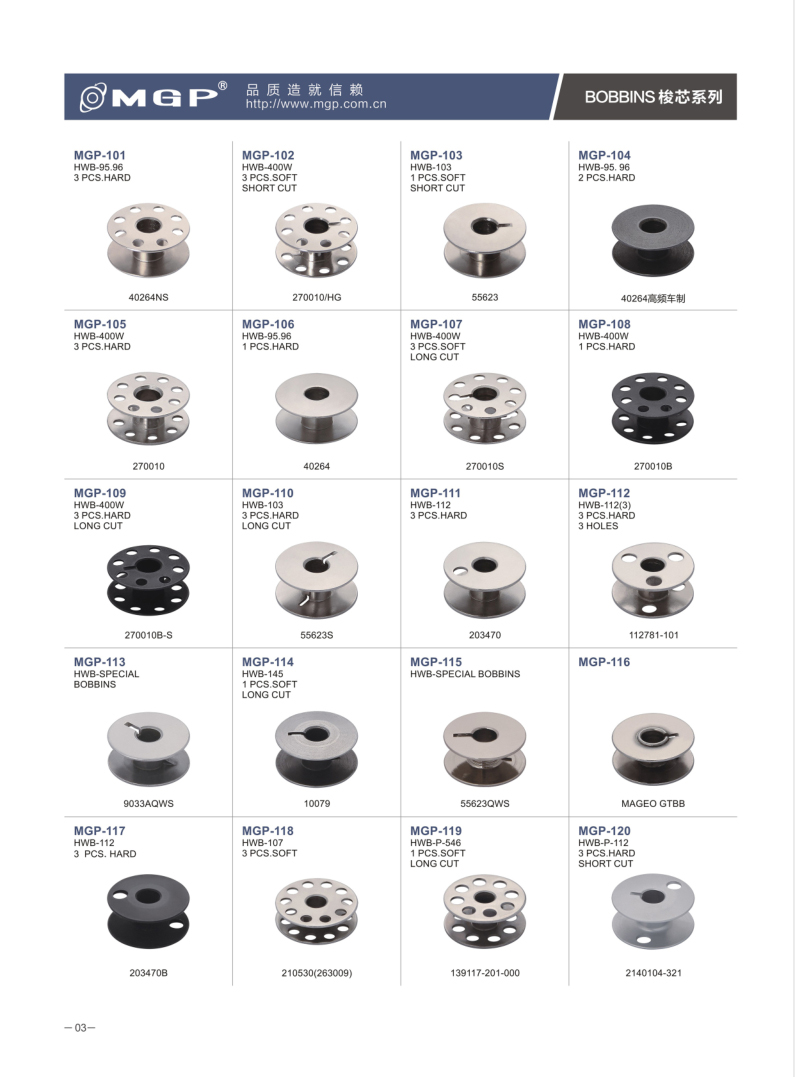 寧波市宏威機(jī)械制造有限公司 MGP品牌成立于1990年,總部位于浙江寧波。企業(yè)分為浙江寧波、浙江紹興、河北、三大生產(chǎn)基地。全產(chǎn)業(yè)鏈自主生產(chǎn)的全產(chǎn)業(yè)鏈。是國內(nèi)較大的梭芯生產(chǎn)基地和縫紉機(jī)配件的企業(yè)之一。是我國縫配件梭芯、梭殼縫配件出口量較大企業(yè)。MGP品牌產(chǎn)品與各大整機(jī)公司配套,并銷售80多個(gè)地區(qū),深受客戶信賴。